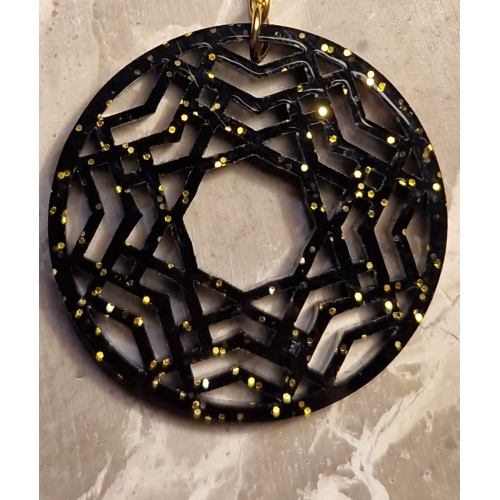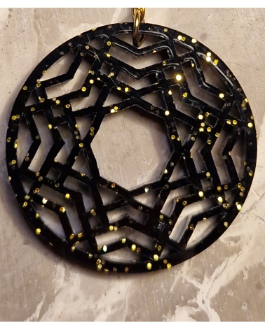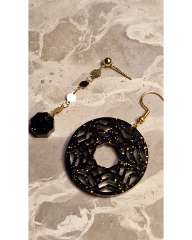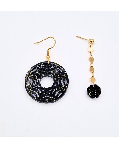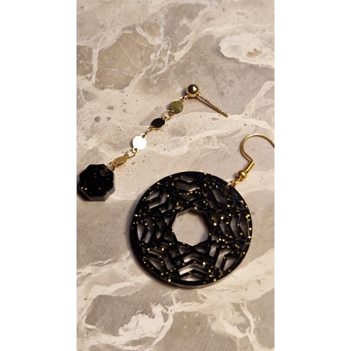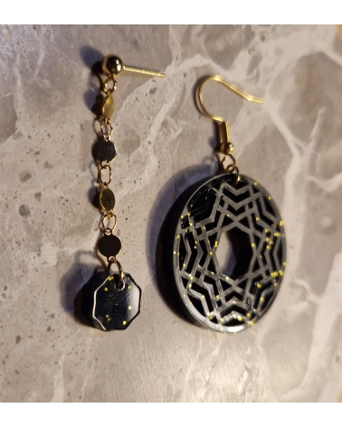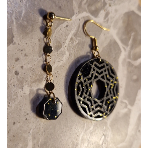 Inspirées des motifs étoilés de l’art oriental, ces boucles asymétriques en plexi noir pailleté or brillent comme un ciel désertique. Entre rosace ajourée et étoile suspendue, elles allient mystère, lumière et élégance intemporelle.