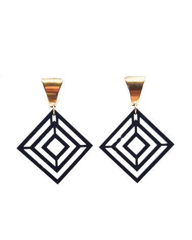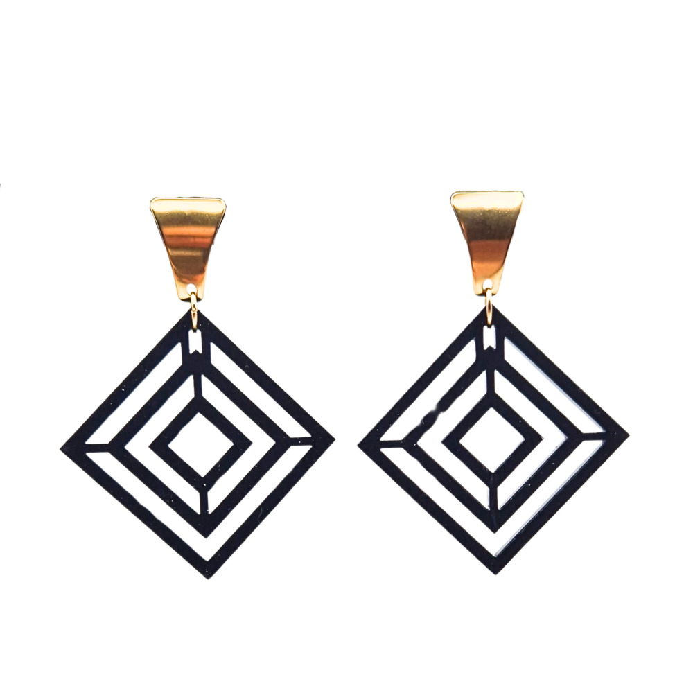 Des boucles d’oreilles design en plexi noir mat, fines et légères, montées avec des attaches en inox doré. Le contraste graphique entre le noir profond et l’inox couleur or crée une silhouette moderne, minimale et audacieuse, idéale pour un style affirmé au quotidien, durable et résistant au temps.